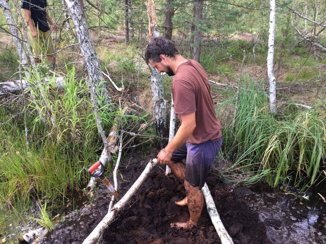 Dobrovolník Jiří Vrtiška sešlapává kousky rašeliny uprostřed odvodňovacího kanálu, chvílemi stojí až po stehna v rašelině. „Zkrátka jde o to, aby odsud neodtékala voda. Nanášíme rašelinu, aby se tady dařilo vegetaci, je potřeba, aby to znovu zarostlo. Je to prospěšná práce, baví nás to a jsme na za to rádi,“ komentuje.