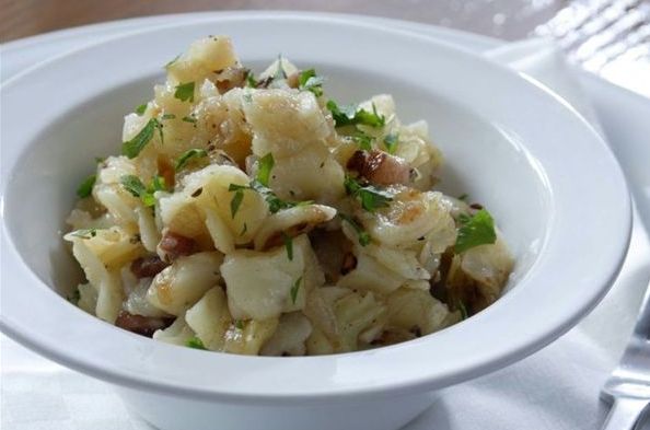 - Nadrobno nakrájíme cibuli a osmahneme ji spolu s nakrájenou slaninou a česnekem.