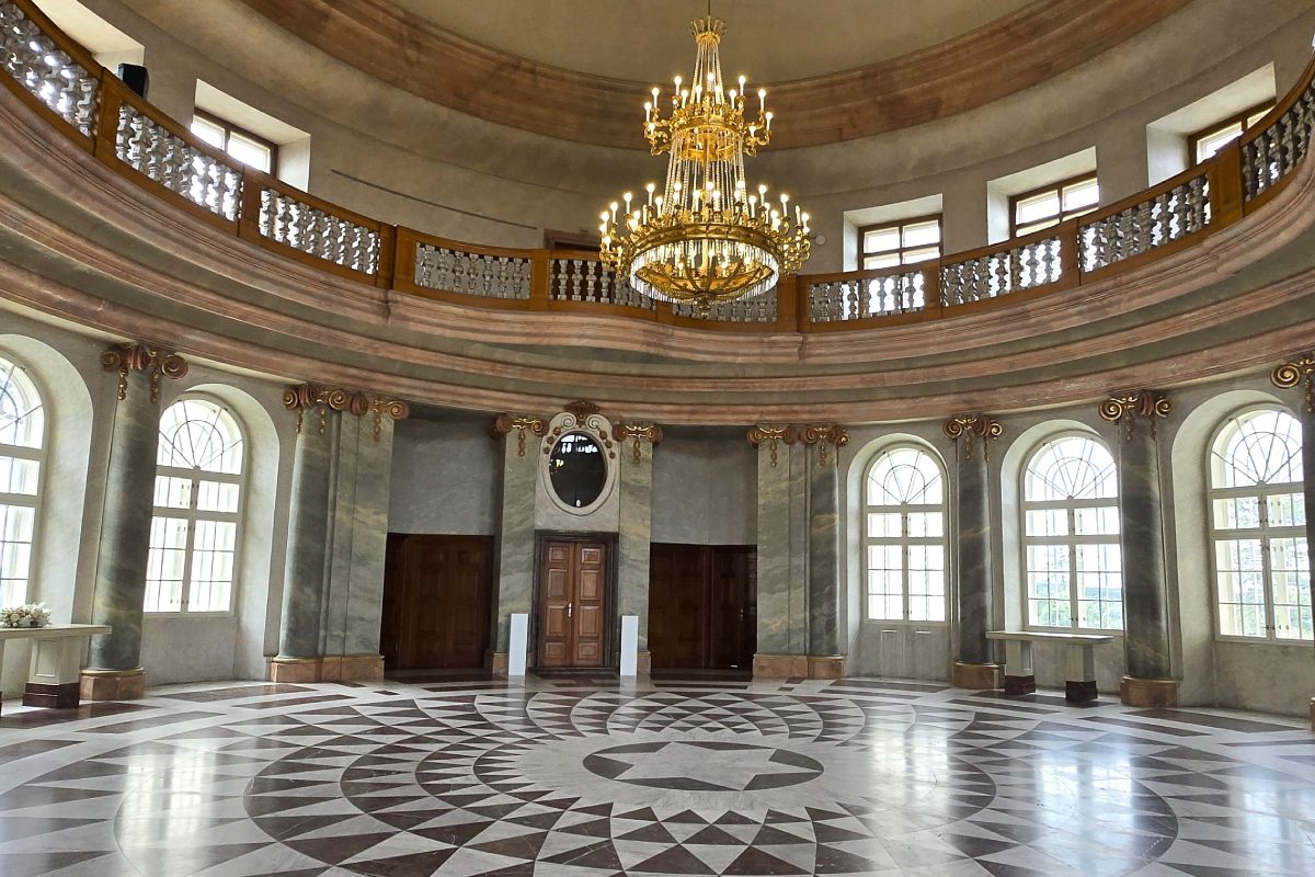 V každém patře najdete deset místností a centrální kruhový sál. V přízemí Sloupový, v patře pak Mramorový sál. Každý z pokojů je spojený s příběhem a se zajímavostmi. Například v Císařské jídelně stojí sloupové hodiny, na kterých je vlastnoručně psaná poznámka od Oktaviána Kinského: 30. května 1866 bylo silné krupobití, které zničilo celou úrodu.