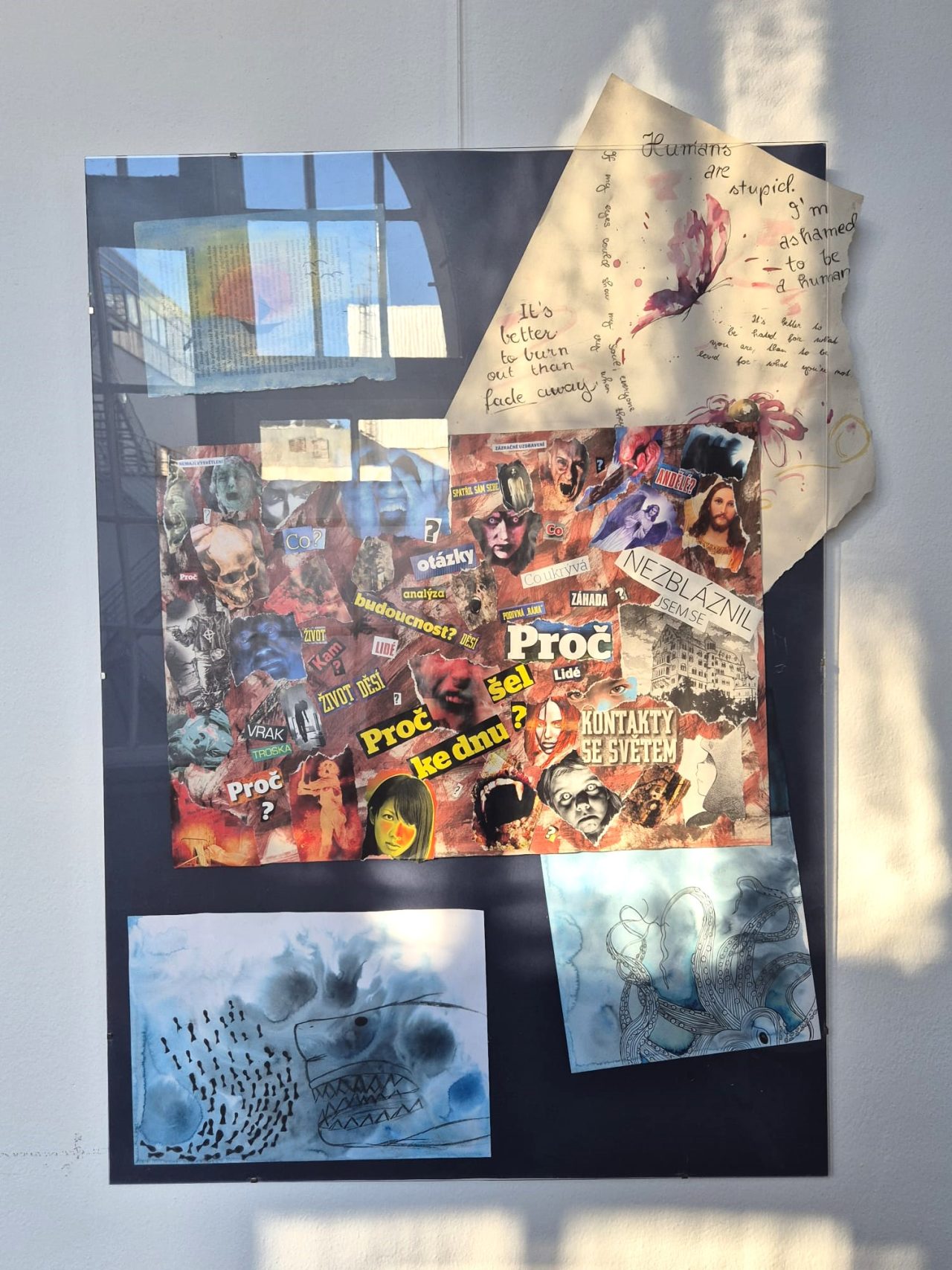 „Támhle vidíme například koláž na téma předávkování, vyloženě je to tam vidět,“ ukazuje arteterapeutka Radka Žáčková tvorbu dětí z dětského oddělení českobudějovické nemocnice. Díla si prohlíží také primář Jan Hřídel. „Je to velice závažná tematika a opravdu to nabízí náhled do nitra dětí,“ říká.