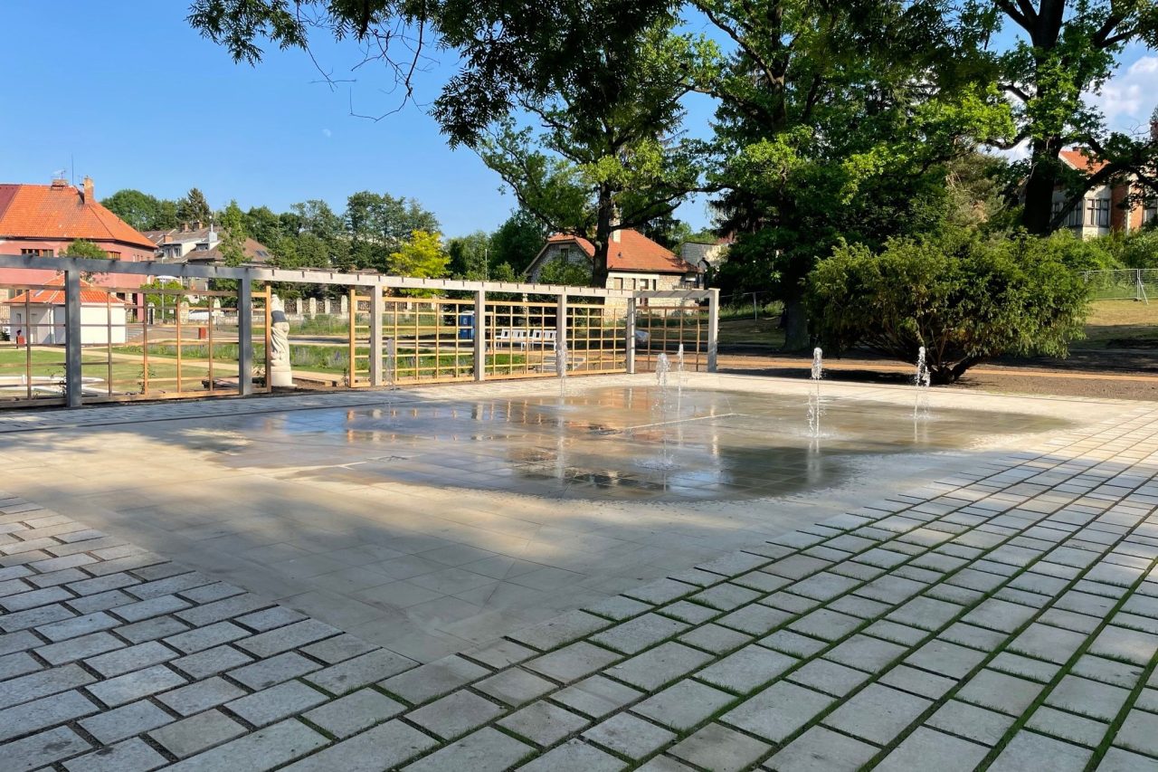Další vodní prvek najdeme v těsné blízkosti. Dnes jde o odpočinkovou část pro veřejnost, dřív tu Přibylovi měli bazén. Aby byl původní charakter zahrady zachován, byly obnoveny obrysy původního bazénu, jen voda je tu využita jiným způsobem. Do mělké vodní plochy vyplňující celý prostor byly umístěny vodní trysky stříkající vodu do výšky.
