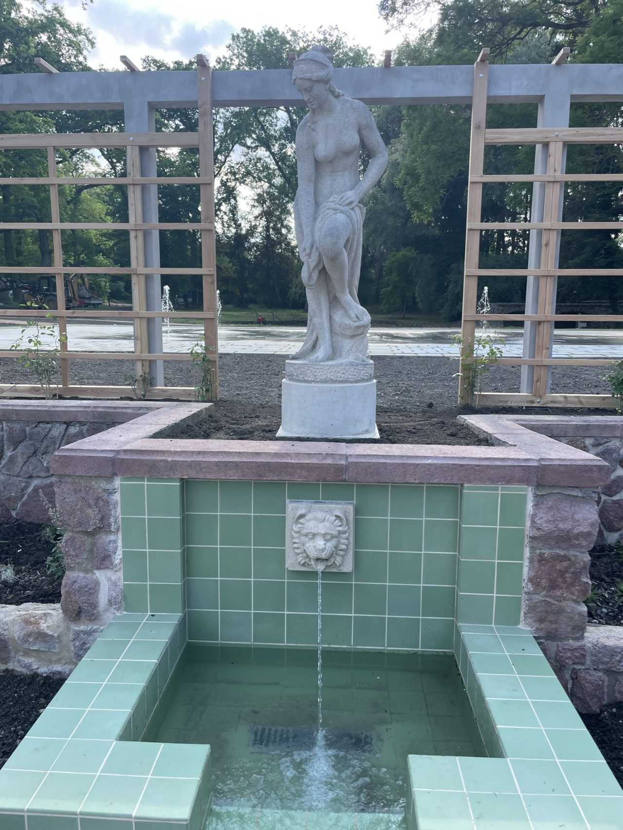 Zajímavé je i okolí bývalého bazénu. Podle původních plánů byly nově vyrobené dřevěné treláže upevněné na betonové konstrukci, kde volný prostor vyplňují popínající růže a přirozeně tak vytváří pocit soukromí. Na tento prvek pak navazuje replika kašny s bledě zeleným kachlovým obkladem a sochou Dámy po koupeli. Ta byla součástí původní zahrady a v rámci rekonstrukce se po dlouhých letech vrátila na své původní místo. Nechybí ani zrestaurovaný chrlič vody v podobě lva.