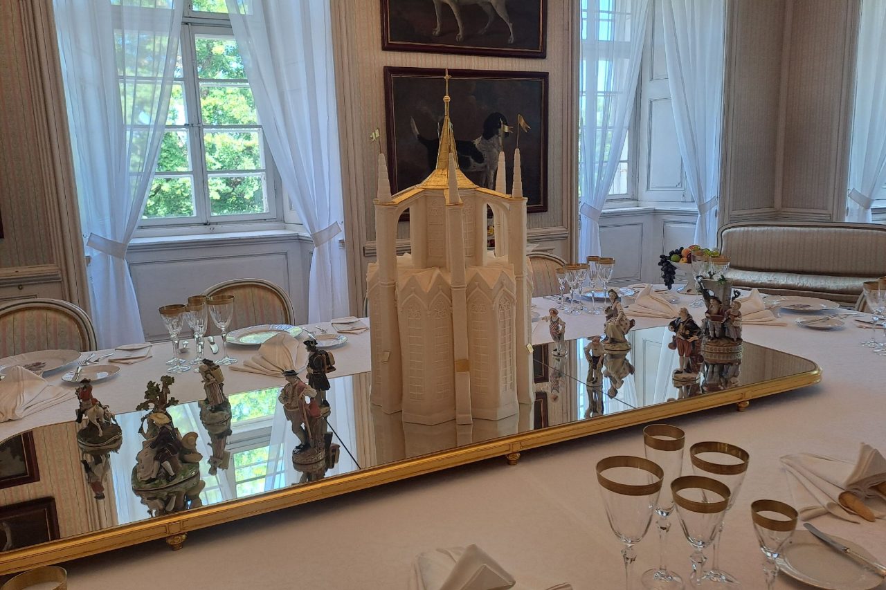 Stůl ve velké jídelně je prostřený přesně tak, jako při několikadenní návštěvě císařské rodiny v červenci roku 1812 na zámku. Uprostřed stolu stojí na zrcadlovém podnose model novogotického templu, nejstarší rozhledny v Evropě, který je zlatým hřebem procházky v zámeckém parku. Model templu je vyrobený z tragantu, což je hmota vyrobená z cukru a pryskyřice.