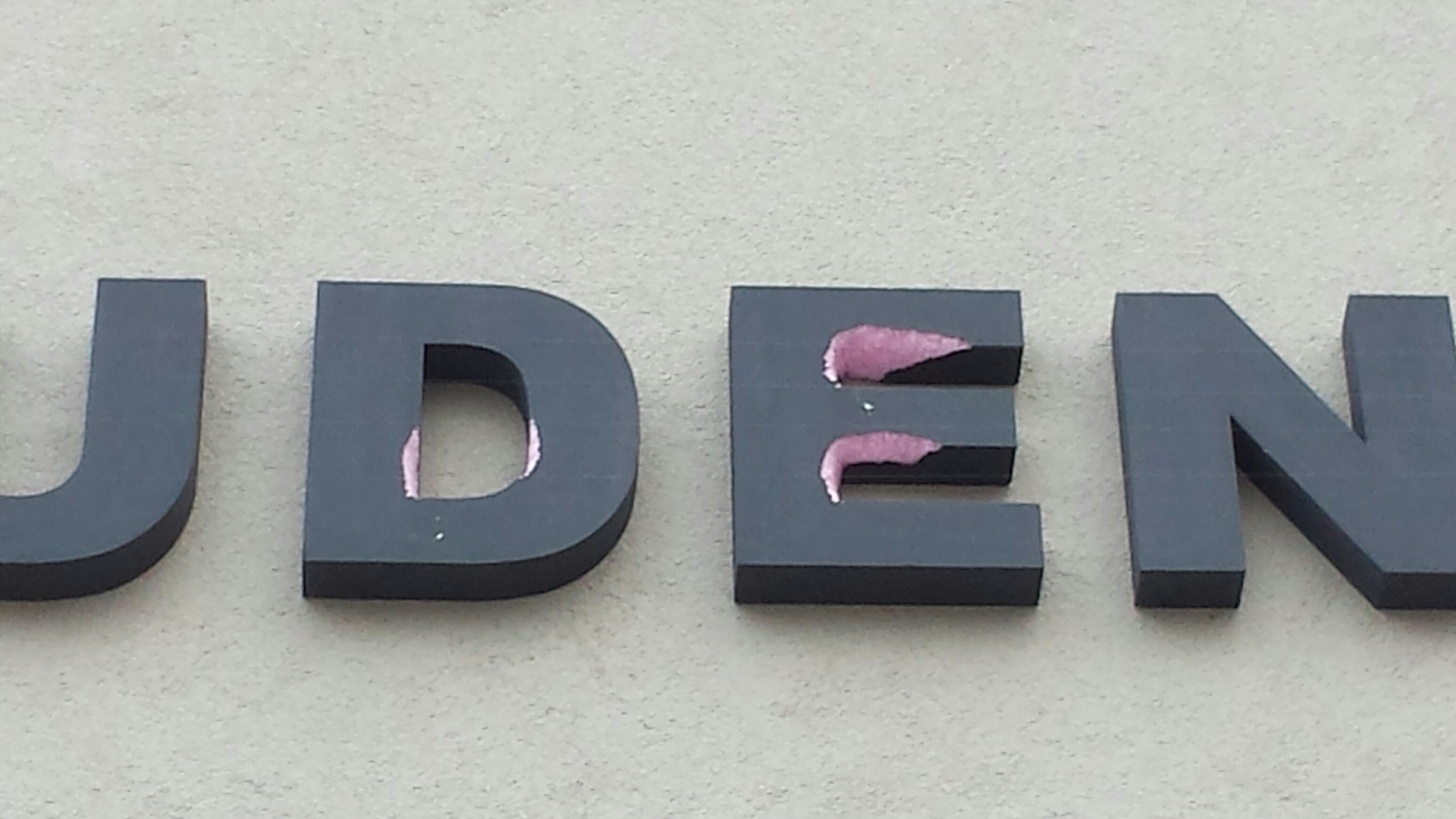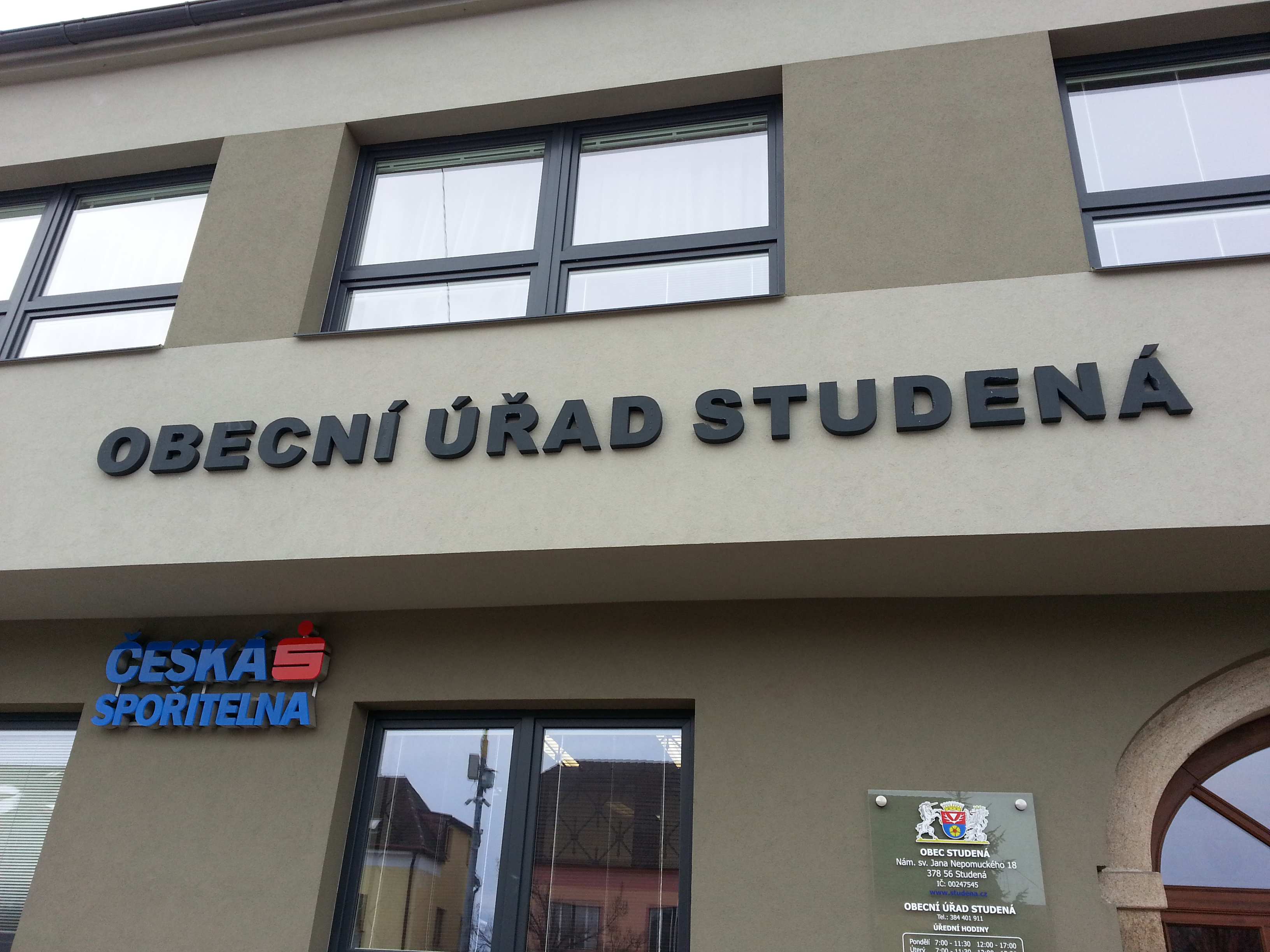 Nápis Obecní úřad na budově, kde sídlí vedení obce Studená, se stal cílem vandalů. V písmencích, která jsou vyrobená z polystyrenu, se začaly objevovat podivné důlky.