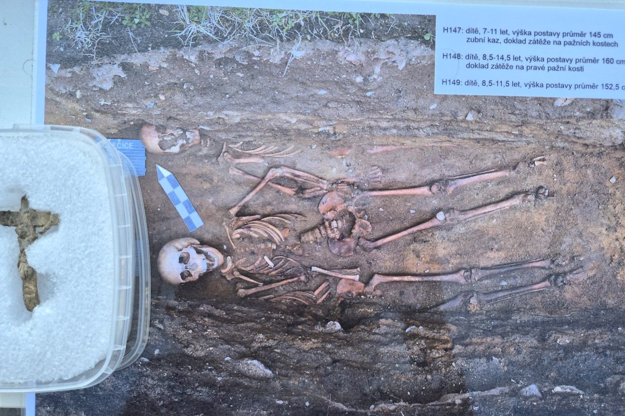 Archeologové odkryli u kostela také hromadný hrob, ve kterém byly uloženy tři děti. „Byly pohřbeny ve stejnou dobu a lze předpokládat, že to mohlo být součástí období větší úmrtnosti, doby hladomoru, nějaké epidemie. U dětí je zřetelná zátěž pažní kosti, pravděpodobně už v mladém věku musely aktivněji pracovat, nosit nějaká břemena a podobně,“ uvádí archeolog.