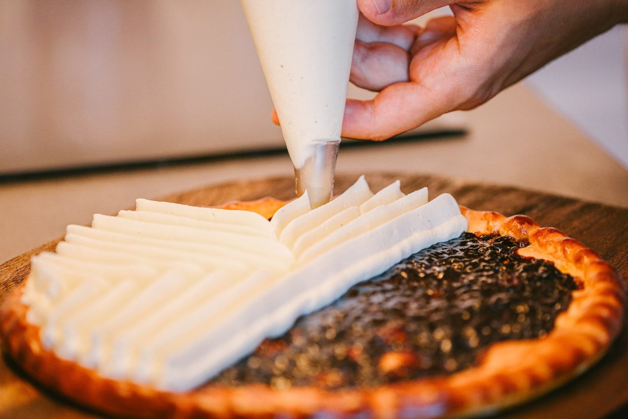 Vychladlý koláč zdobíme připraveným krémem pomocí speciální špičky. Efektivně vypadají pruhy, když koláč nejdříve rozdělíme proužkem krému na polovinu, pak na čtvrtiny, a do každé čtvrtiny střídavě vytváříme pruhy svírající pravý úhel. Má to vzor rybí kosti.