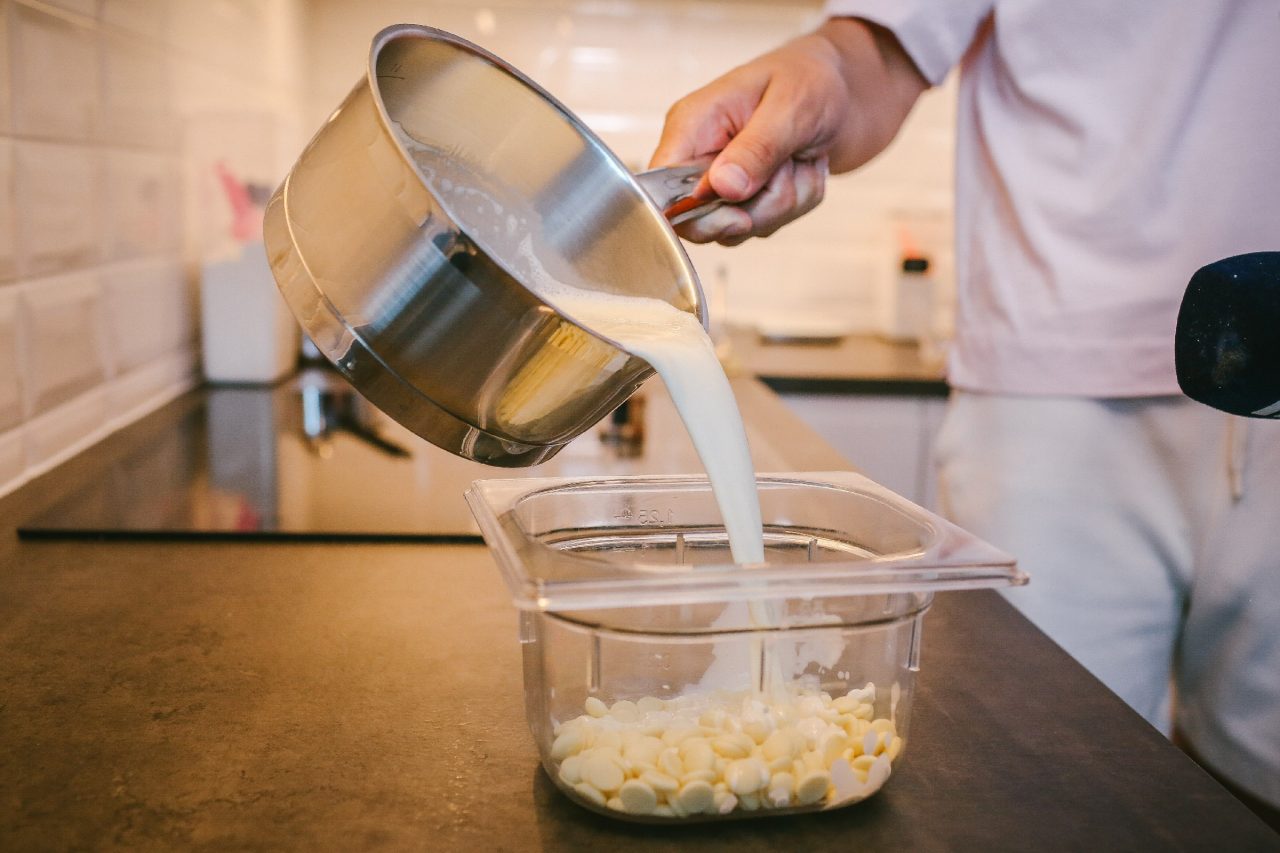 Na ganáž si předem připravíme bílou čokoládu, kterou zalijeme smetanou zahřátou těsně pod bodem varu. Čokoláda se rozpustí, takže není potřeba ji zahřívat společně se smetanou. Ještě si do ní přidáme plátky želatiny, které jsme předtím namočili do studené vody a nechali 3 až 5 minut bobtnat. Vše promixujeme tyčovým mixérem.