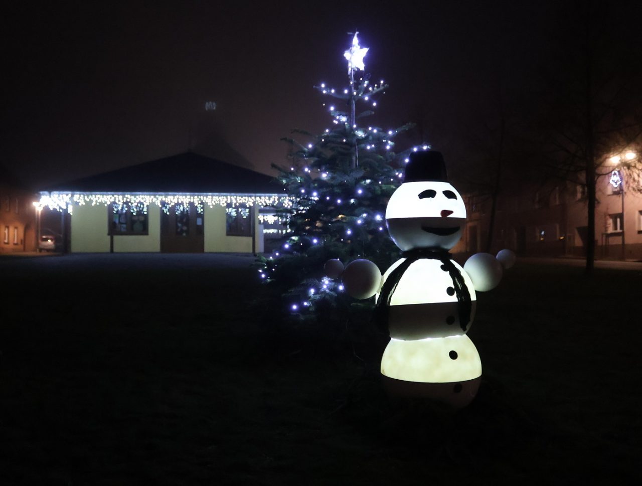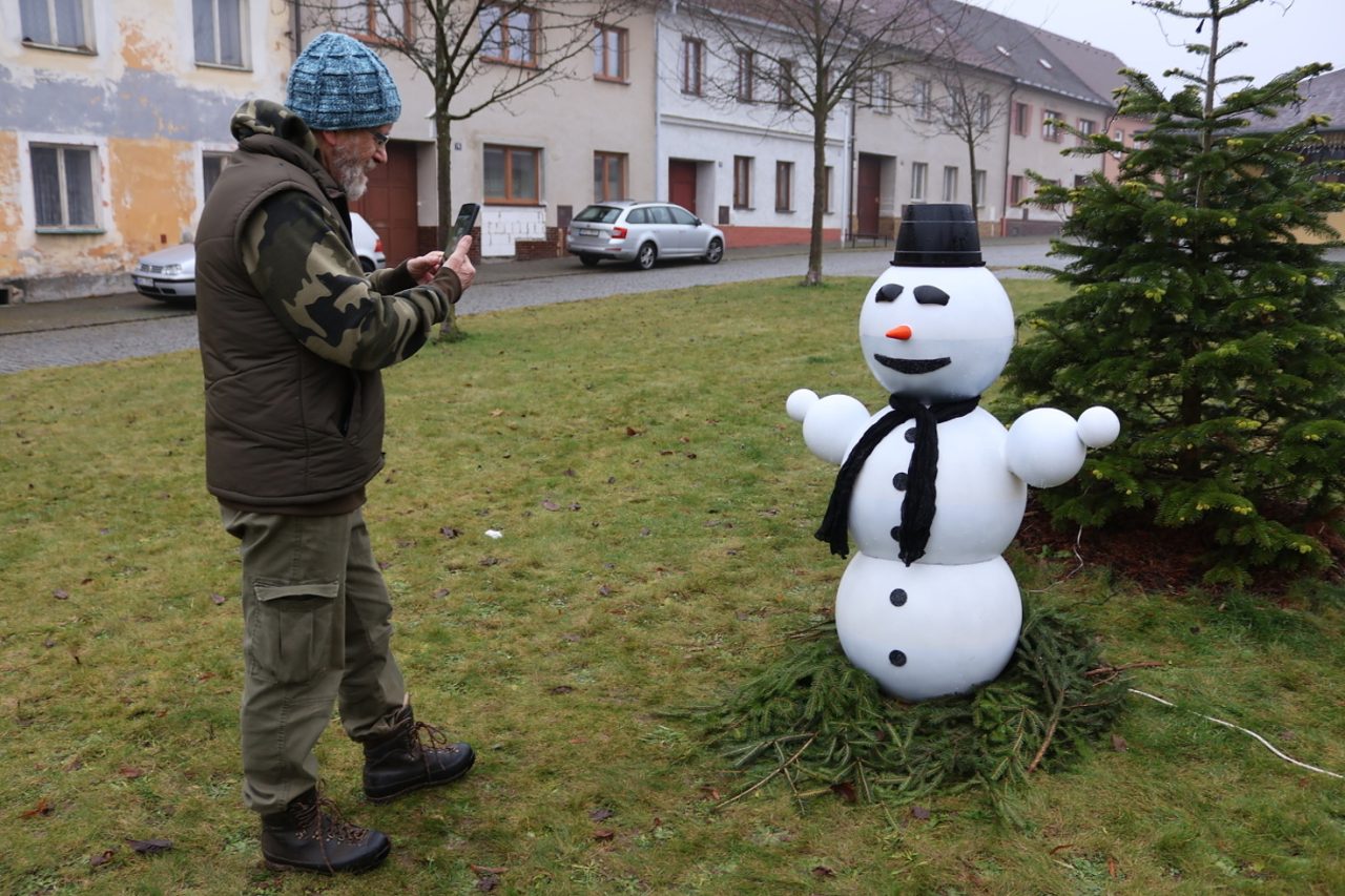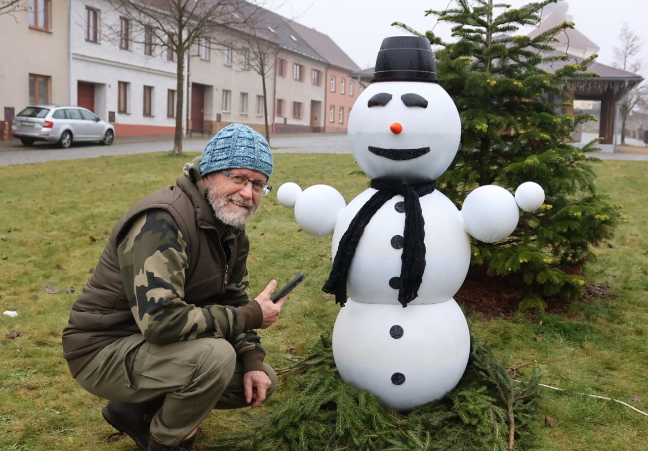 Staré koule, které zakrývaly výbojky, doslova vybízely k výrobě sněhuláka. Oči nahradily rozbité brýle, nos je ze značkovacího kolíku pro sportovní trasy, pusa a knoflíky z kousků filce a klobouk nahradil květináč. Originální sněhulák z veřejného osvětlení také svítí a je oblíbeným místem k fotografování.