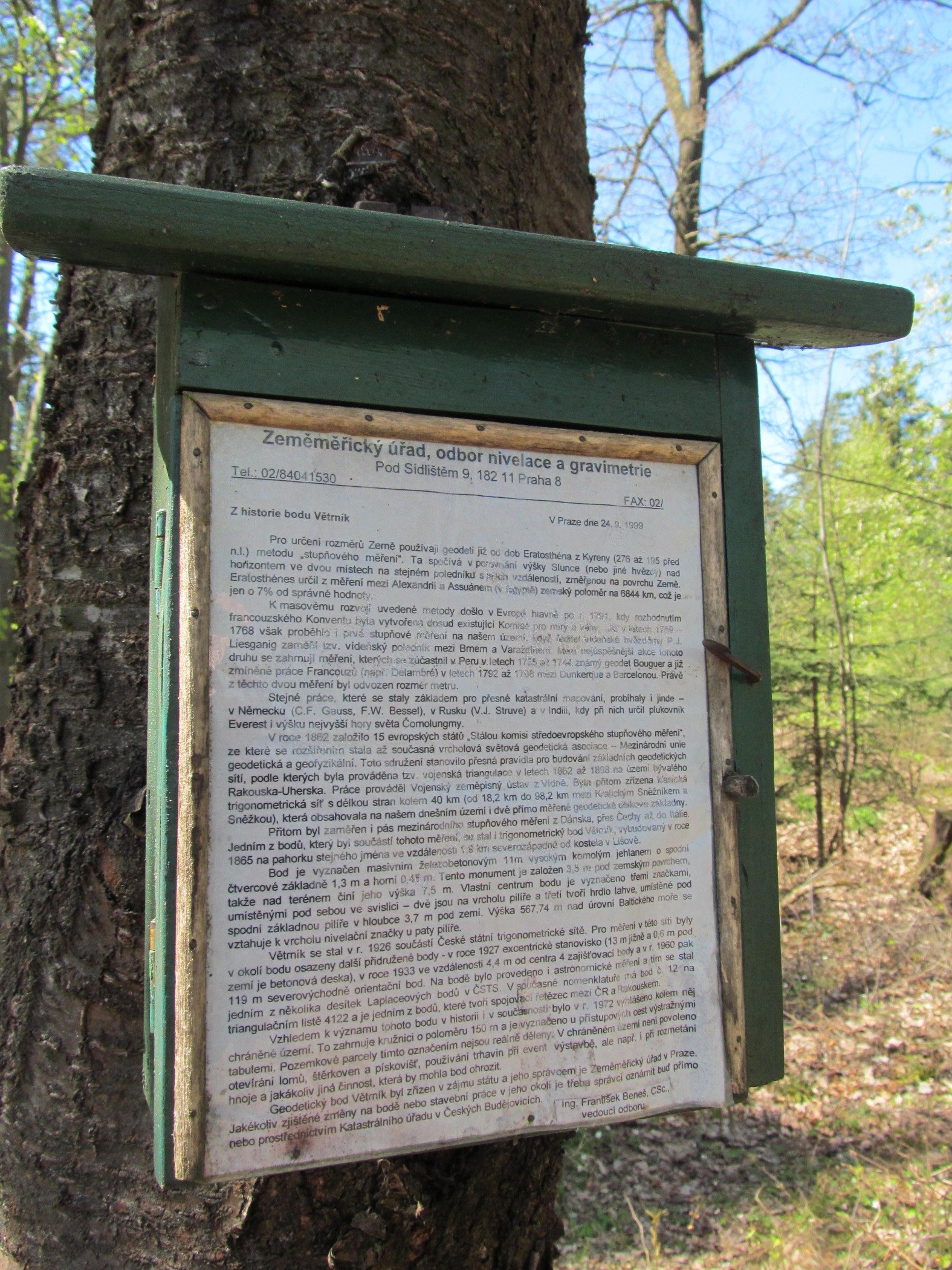 „V roce 1862 založilo 15 evropských států takzvanou Stálou komisi středoevropského stupňového měření. Z této komise se pak později stala Vrcholová světová geodetická asociace. Sdružení stanovilo přesná pravidla pro budování základních geodetických sítí, podle kterých byla prováděna takzvaná vojenská triangulace v letech 1862 až 1898 na území Rakouska-Uherska. Práce prováděl Vojenský zeměpisný ústav z Vídně,“ stojí napsáno u stély na vrcholu Větrníku. Autorem je František Beneš ze Zeměměřičského ústavu v Praze.